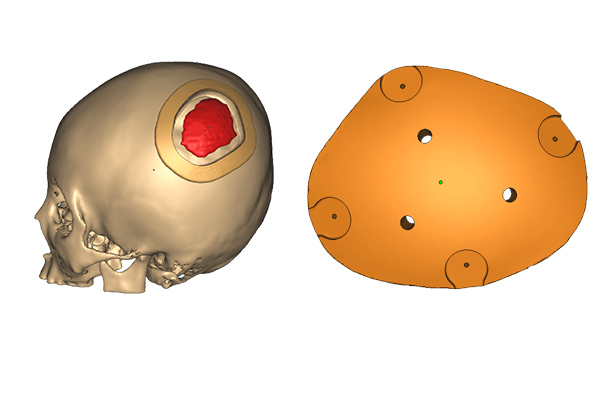 空军军医大学唐都医院某患者患有头部肿瘤,需要进行颅骨植入手术来修复损伤区域。根据患者的CT扫描数据,医生使用CAD软件设计了一套“量身定做”的颅骨片结构。通过借助INTAMSYS远铸智能的3D打印技术,利用高性能PEEK材料进行FDM(熔融沉积建模)打印定制化颅骨片。手术中,医生根据设计方案精确植入颅骨片,成功修复了患者头颅的损伤区域。术后复查显示,颅骨片与患者的自然骨骼完美嵌合,无伪影问题,且患者术后恢复顺利。