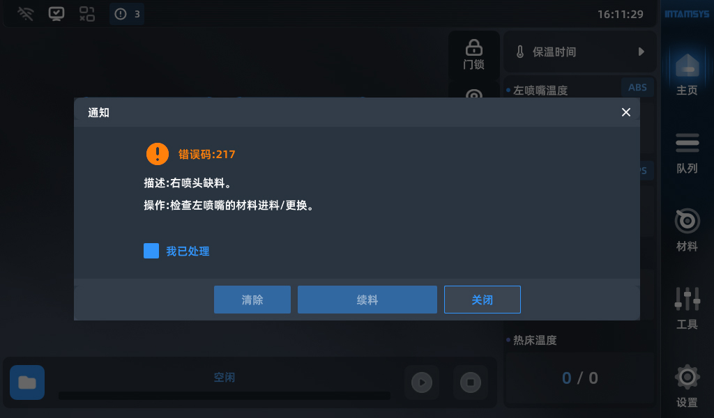 远铸智能的系列3D打印设备提供断料续打功能,均配备缺丝检测传感器,当检测到丝材耗尽时,设备屏幕上会出现通知信息,告知您需要手动续料以继续打印。同时,在暂停期间,设备会维持腔室及平台温度,防止模型由于温度变化产生的负面影响。
